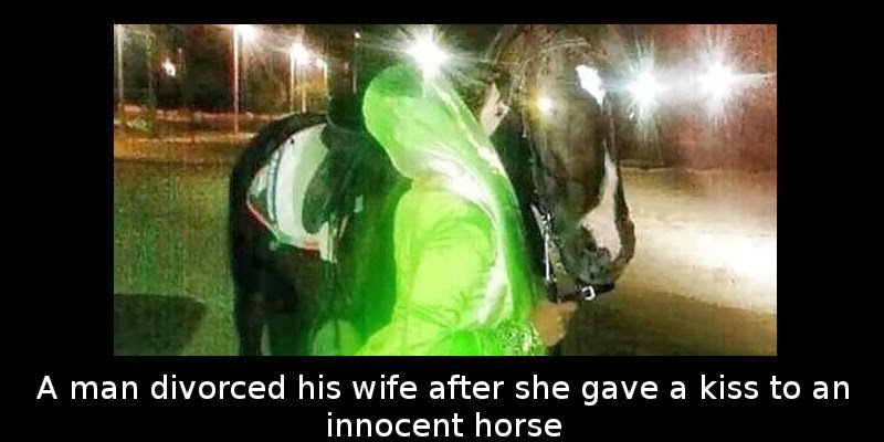 An unnamed woman from Saudi Arabia published a picture of herself while she was giving a kiss to a horse during a trip at a farm near Riyadh. After her husband saw the photograph on her page on a social networking website, he was so infuriated with her that he demanded a divorce. Whether it was jealousy or something else, the two divorced short after.